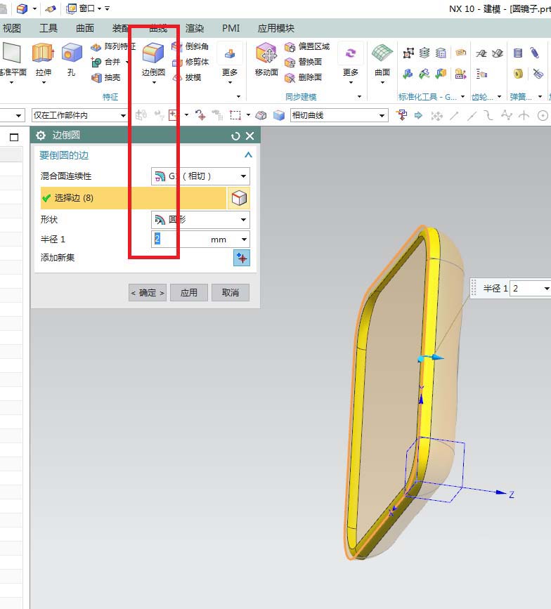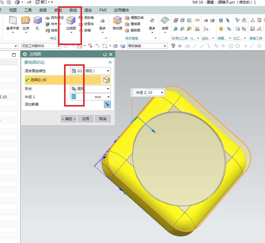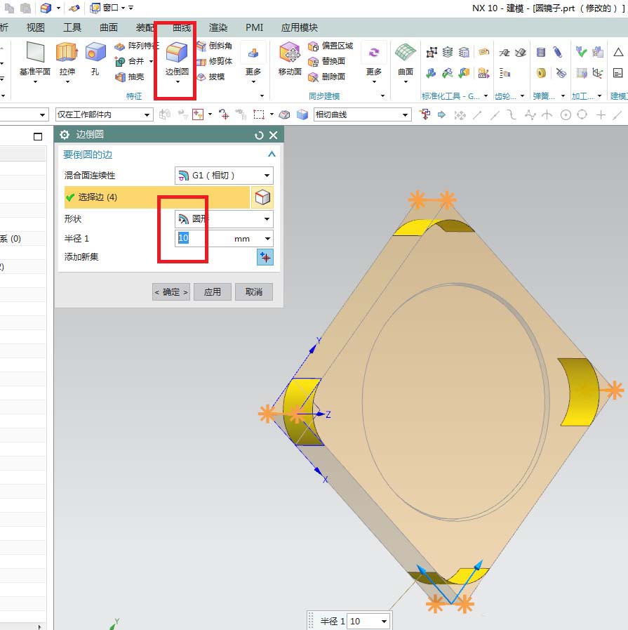 8、如下圖所示,單擊工具欄中的“邊倒圓”圖標(biāo),激活該命令,然后點(diǎn)擊實(shí)體中的四條棱邊,然后設(shè)置半徑為10,然后點(diǎn)擊“應(yīng)用”。