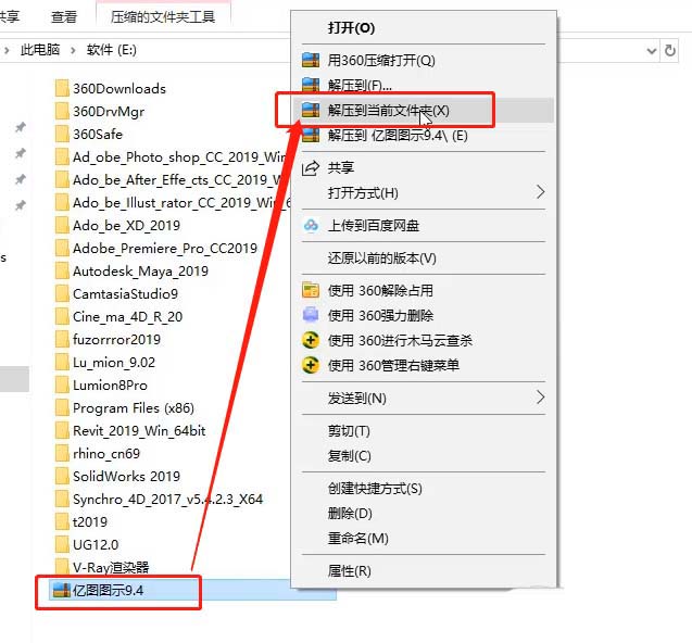 2、右鍵單擊,解壓億圖圖示9.4安裝包。下載完成之后,找到億圖圖示9.4的安裝包,鼠標(biāo)右鍵單擊安裝包,選擇解壓到當(dāng)前文件夾,等待解壓完成會出現(xiàn)一個新的文件夾,雙擊進入億圖圖示9.4的安裝文件夾內(nèi);