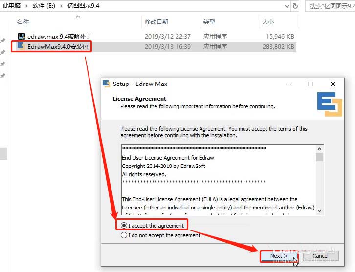 3、打開億圖圖示9.4安裝程序。雙擊打開圖中“Edraw Max9.4.0安裝包”點擊我同意,再點擊“Next”下一步;