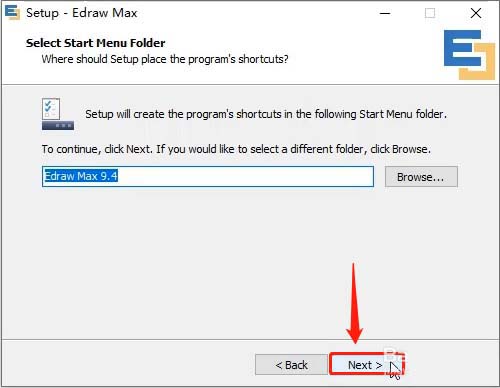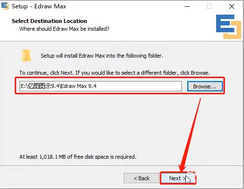 4、點“Browse”設(shè)置安裝路徑。安裝路徑默認(rèn)是C盤系統(tǒng)盤,如果按照默認(rèn)的路徑安裝的話,會占據(jù)電腦較多的內(nèi)存空間,以后作圖過程中可能會導(dǎo)致電腦出現(xiàn)卡頓的現(xiàn)象,所以我們需要手動設(shè)置安裝路徑到除C盤以外的文件夾,我是直接選擇了解壓億圖圖示9.4的文件夾作為安裝路徑;