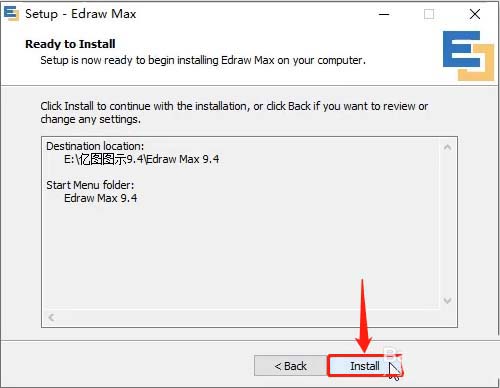 7、確認(rèn)路徑及文件夾名稱無誤,點擊Install安裝。這里是準(zhǔn)備安裝的提示,顯示的有億圖圖示9.4的安裝路徑和快速啟動欄的文件夾名稱,再次確認(rèn)無誤的話,點擊安裝;