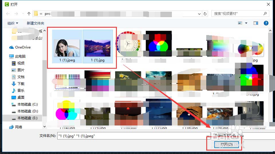 3、Camtasia 9會自動彈出“打開”的對話窗口,在打開對話窗口中選擇兩個素材不一定非要是視頻,選擇在Camtasia 9中打開。