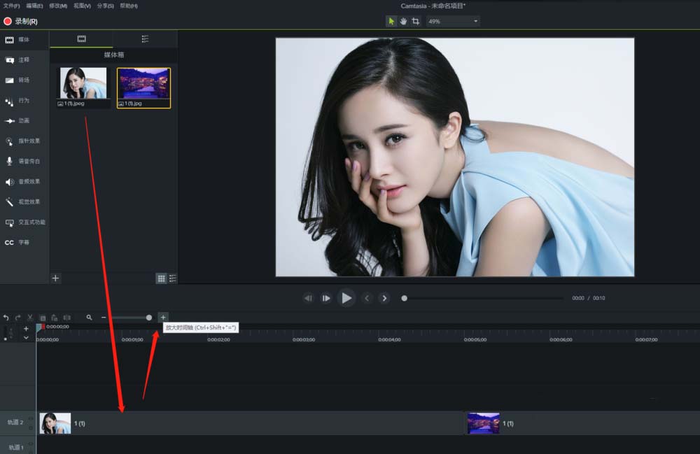 4、將導(dǎo)入的兩張圖片素材都拖到時間軸的同一個軌道中,并點擊放大時間軸。