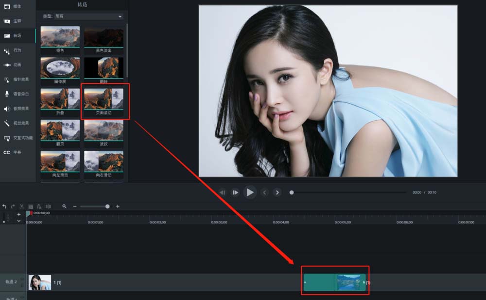 5、找到Camtasia 9內(nèi)置的轉(zhuǎn)場選項,在Camtasia 9轉(zhuǎn)場選項中選擇“頁面滾動”轉(zhuǎn)場給兩個素材中間過渡位置添加。