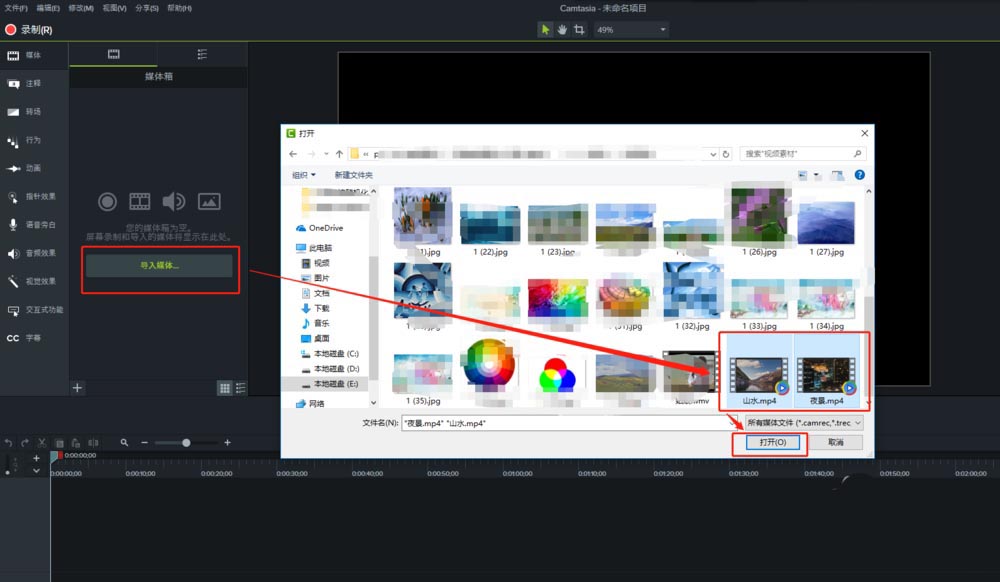 2、新建了一個(gè)空項(xiàng)目之后,執(zhí)行導(dǎo)入媒體,在打開(kāi)窗口中選擇兩個(gè)視頻媒體打開(kāi)。