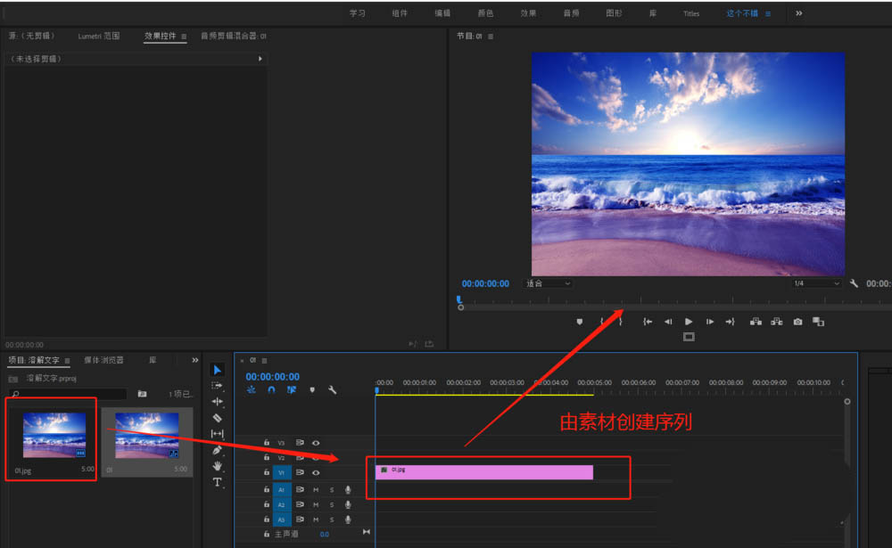 2、選中導入的素材,拖到時間軸窗口單擊,讓PR根據(jù)素材來創(chuàng)建一個序列。