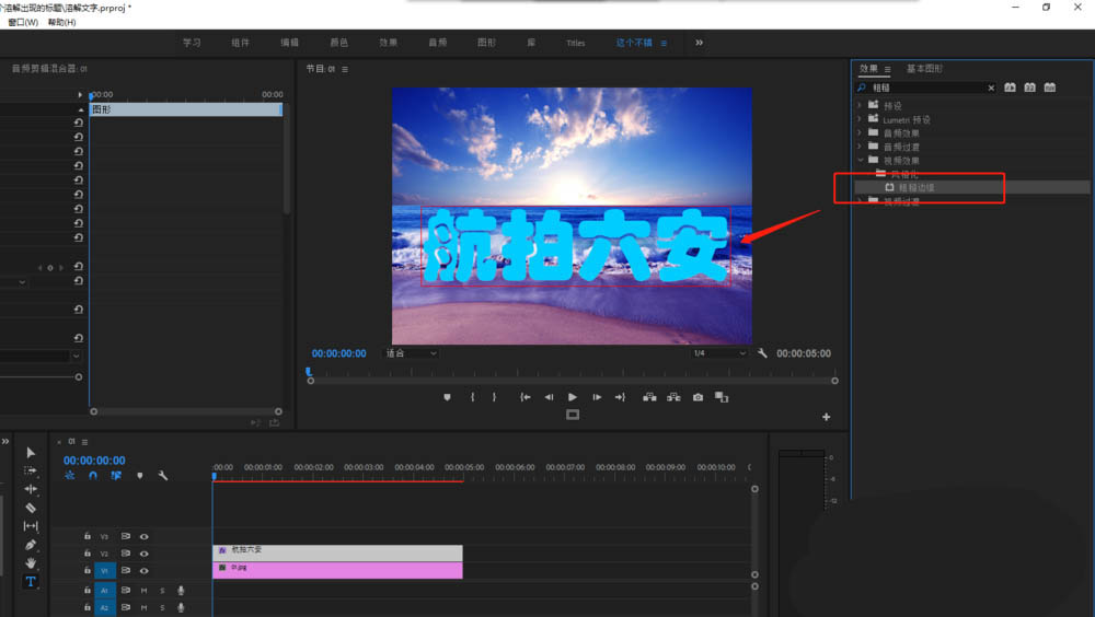 4、顯示效果窗口,在效果窗口中搜索找到“粗糙邊緣”這個PR內(nèi)置效果,將這個效果添加給標題文字。