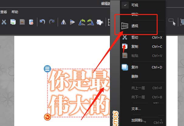 3、選中當(dāng)前文字,在屬性欄中,找到如圖的透視網(wǎng)格屬性,點(diǎn)擊下