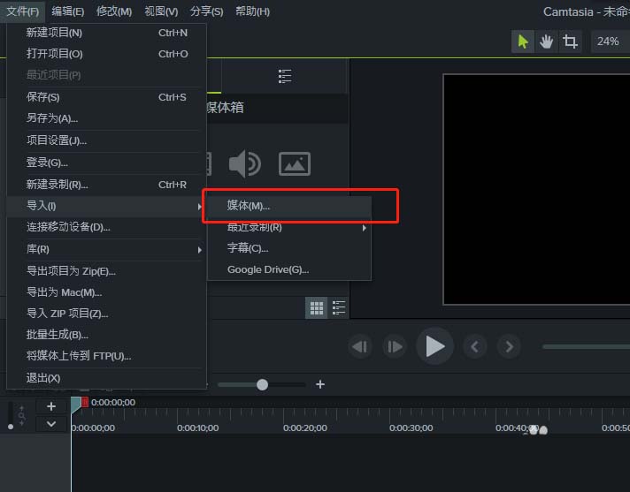 1、創(chuàng)建一個(gè)空Camtasia 9項(xiàng)目,選擇執(zhí)行文件菜單的導(dǎo)入,執(zhí)行導(dǎo)入媒體。