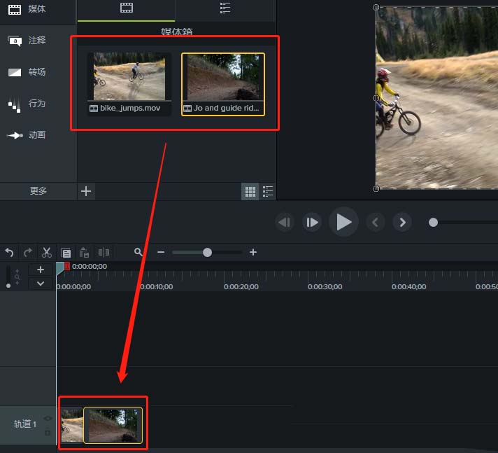 3、先選中一個(gè)媒體素材拖到時(shí)間軸軌道1,在選中另一個(gè)媒體素材拖到同一時(shí)間軸軌道前一媒體素材的后面。