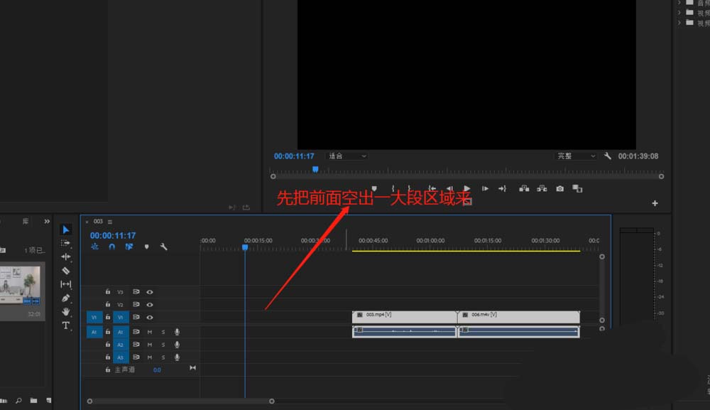2、先來說一種比較笨的常規(guī)方法,選中兩個視頻素材,將其整體往后移,留出一段空時間軸位置出來。