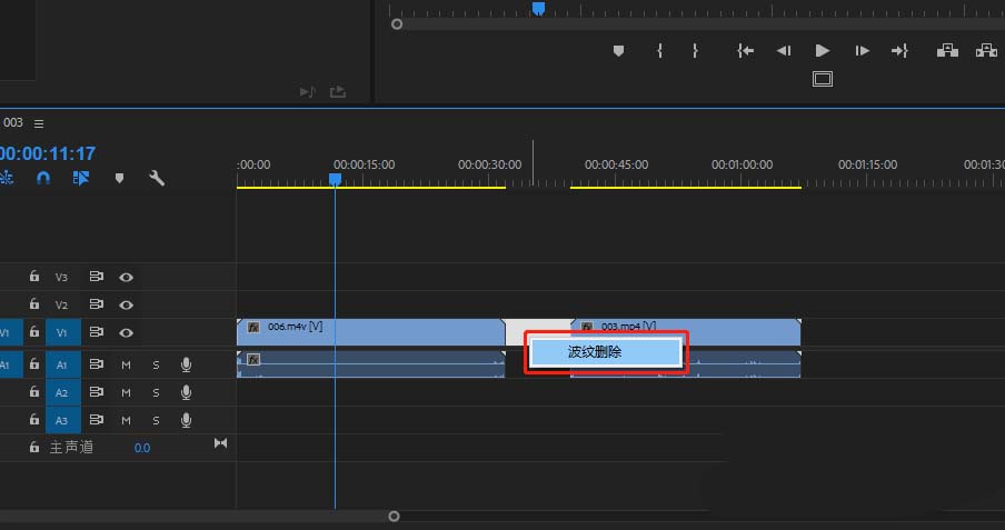 4、在兩段視頻的中間空出的位置上右鍵鼠標(biāo),會出現(xiàn)一個“波紋刪除”的命令,點擊刪除波紋。