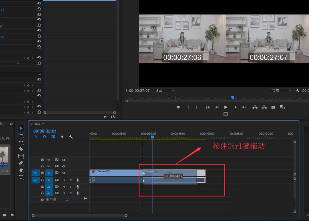 5、上面說的是比較笨的常規(guī)方法,下面說一個比較快捷的方法,先按住鍵盤上的Ctrl鍵不松,直接拖動位于后面的視頻素材往前面位置拖。