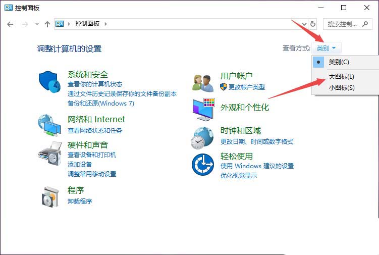 3、之后點(diǎn)擊類(lèi)別邊上的下拉箭頭,然后選擇大圖標(biāo);