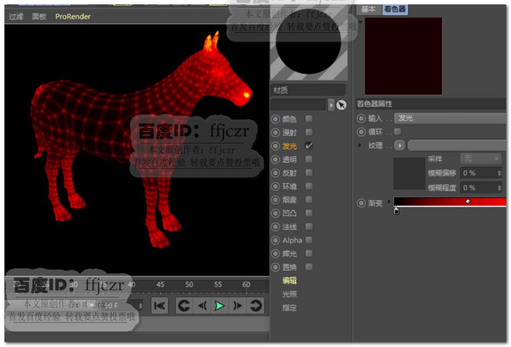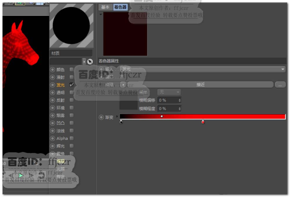 6、點(diǎn)開(kāi)著色器,將著色器漸變色條中最后的黃色去掉;使模型中只有二種顏色(添加多種顏色也可以)的漸變。點(diǎn)渲染即可得到本文所要的效果。