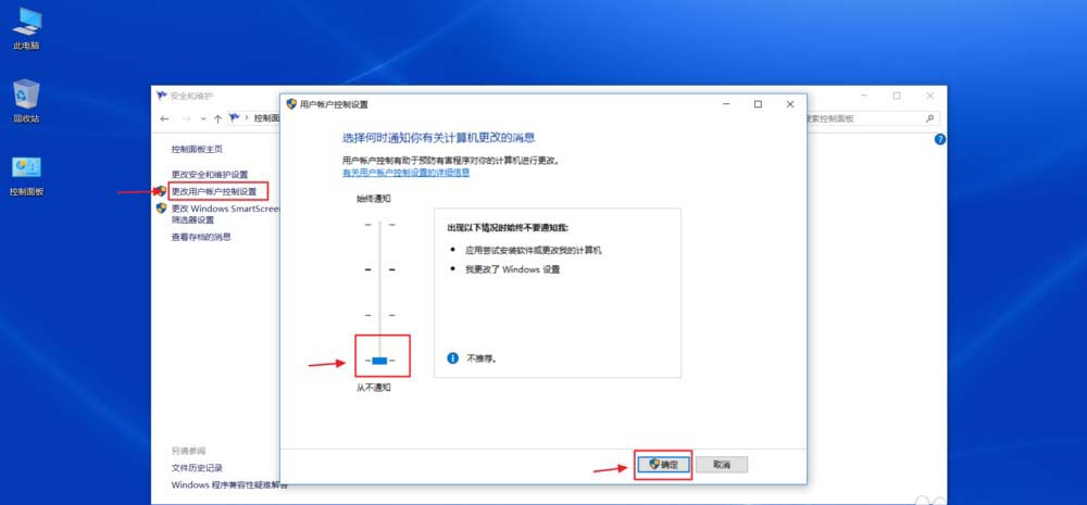 4、更改用戶控制——拉到最底部——確定——是——確定