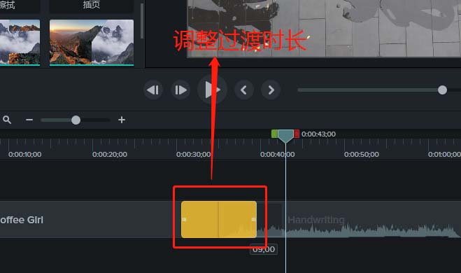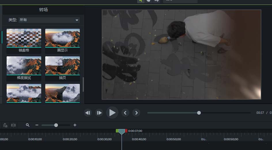 6、調(diào)整完過(guò)渡的時(shí)長(zhǎng)之后,播放時(shí)間軸,觀察過(guò)渡效果,就可以看到時(shí)間軸從梯度擦拭過(guò)渡到下一視頻素材了。