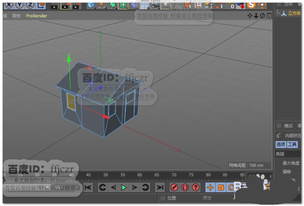 5、面模式中,選中經(jīng)過循環(huán)邊切割構(gòu)成的面;用內(nèi)部擠壓及擠壓的方式,構(gòu)建出房子的門口和窗口(窗口的面不要刪除)。如圖所示。