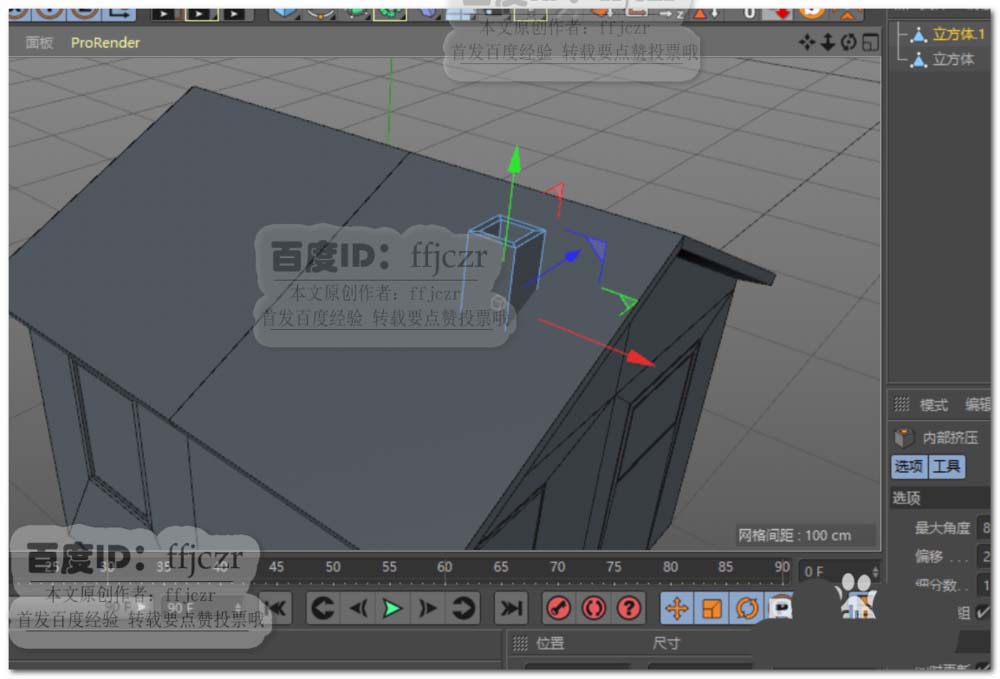 6、創(chuàng)建一個立方體,將其縮小并移動放置于屋頂;將立方體轉(zhuǎn)為可編輯多邊形,面模式中選中立方體的頂面,進行內(nèi)部擠壓再向下擠壓。得到屋子的四方形煙囪。