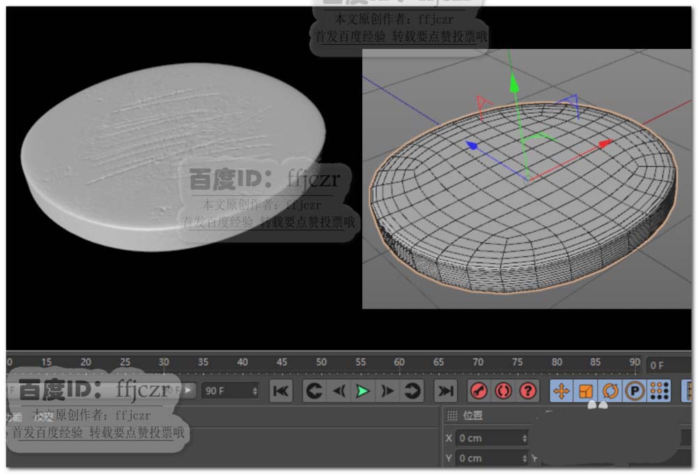 7、回到常用的建模界面,可以看到對(duì)象欄中多出了一個(gè)多邊形,其中帶有雕刻標(biāo)簽的多邊形是添加了4次細(xì)分的曲面‘將其隱藏。在另一個(gè)多邊形上軟件自動(dòng)添加了一個(gè)帶有置換貼圖的材質(zhì)。在沒有渲染時(shí)可以看到其表面只有極少的結(jié)構(gòu)面,點(diǎn)渲染,表面卻可以得到復(fù)雜的細(xì)節(jié)效果,這正是所要的。