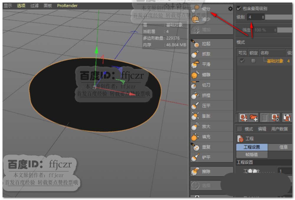 3、轉(zhuǎn)到雕刻界面(sculpt),處于選中模型的狀態(tài)下,給模型添加4次細(xì)分;使模型得到非常多的小面。