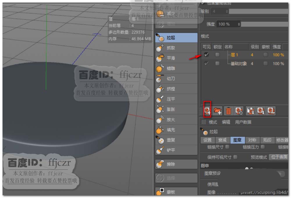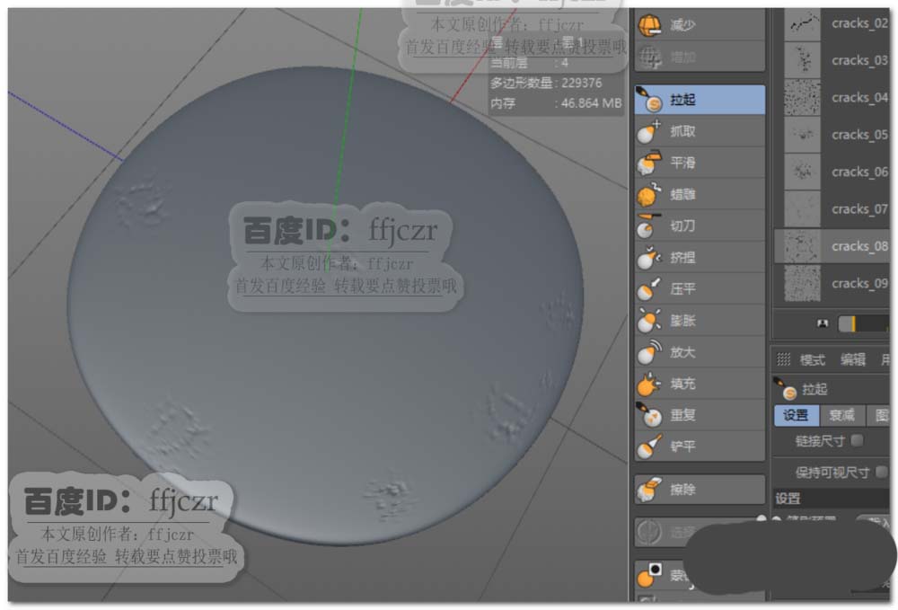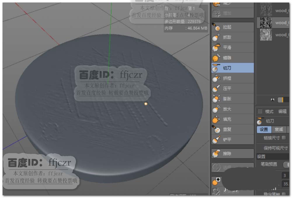 4、在模式中,新建一個(gè)層;選用拉起工具,在預(yù)設(shè)中選用劃痕筆刷,在案板的表面上添加各種不同的劃痕。也可隨意在該面上進(jìn)行各種細(xì)節(jié)的添加,這是在簡(jiǎn)面模型中做不到的。