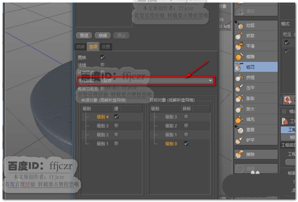 5、細(xì)節(jié)添加完后,點(diǎn)開雕刻菜單,選擇其中的烘焙雕刻對(duì)象。
