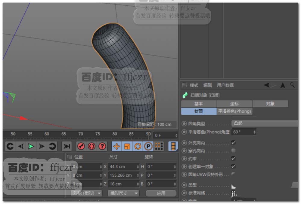 3、將圓環(huán)與圓弧拖到掃描的子級(jí)中,掃描頂端和末端更改為圓角封頂,步幅為3,半徑為5,圓角類型為凸起。