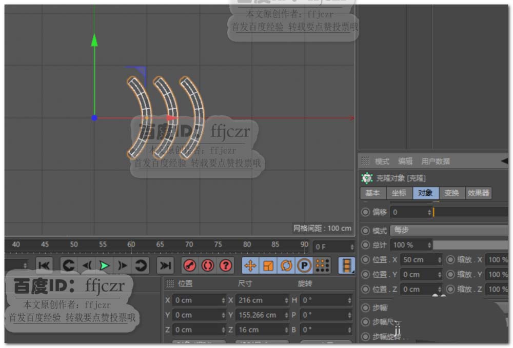 4、給掃描組添加一個(gè)放射克隆,數(shù)量為3,在X軸上數(shù)值為50.