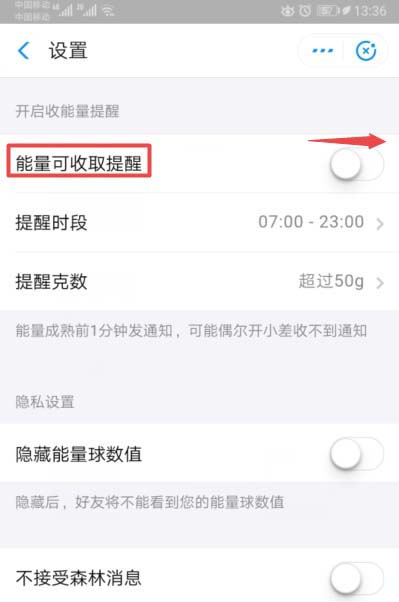 5、之后將能量可收取提醒的開關(guān)向右滑動;