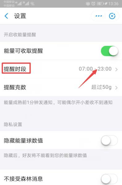6、滑動完成后,我們也就打開了能量收取提醒了,之后點擊提醒時段后面的時間段;