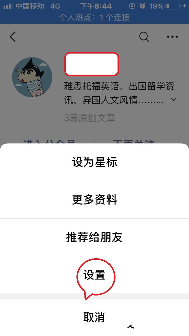 4、點擊右上角“三個點”圖標,彈出提示點擊“設(shè)置”,進入“公眾號消息設(shè)置”。