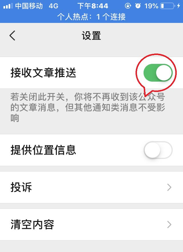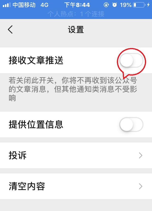 5、微信默認自動開啟公眾號“接收文章推送”,只需點擊將其設(shè)置為“關(guān)閉”,將不再接收公眾號消息。
