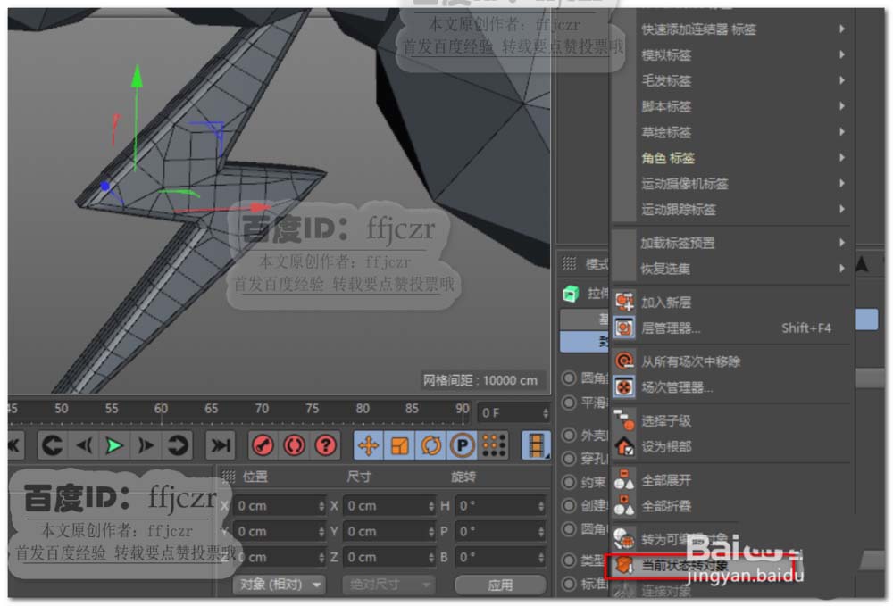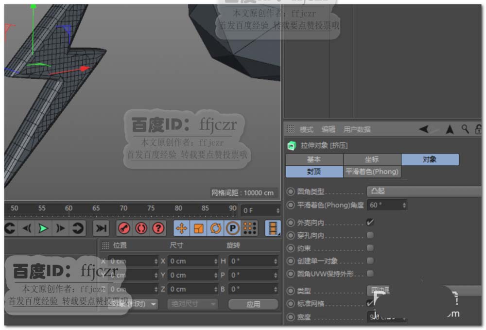7、給上步的多邊形添加一個(gè)擠壓,厚度為30,圓角封頂,步幅為1,半徑為8,類型為四邊形,勾選標(biāo)準(zhǔn)網(wǎng)格。將當(dāng)前狀態(tài)轉(zhuǎn)為對(duì)象,得到結(jié)構(gòu)面分布均勻的閃電模型。