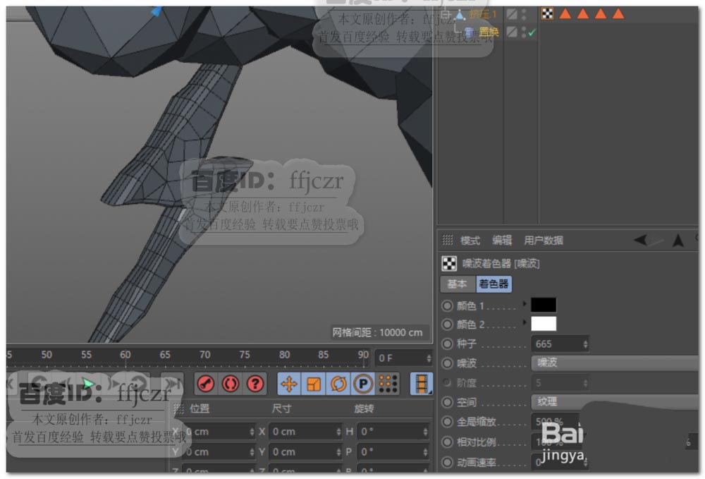 8、給閃電模型添加一個(gè)置換變形器,變形器著色項(xiàng)中添加一個(gè)噪波,將噪波的全局縮放值更改為500%,使閃電模型表面產(chǎn)生輕微的凹凸效果。