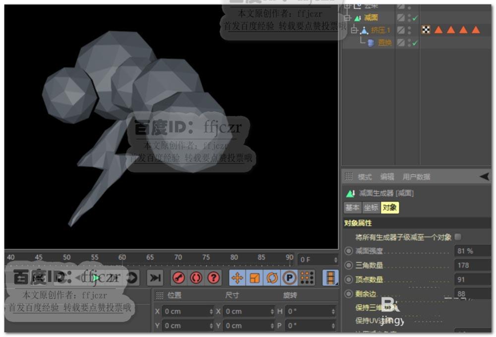 9、閃電模型拖到減面的子級(jí)中,將減面強(qiáng)度值更改為80%。使閃電模型得到低面結(jié)構(gòu)。帶閃電的云朵低面模型創(chuàng)建完成。