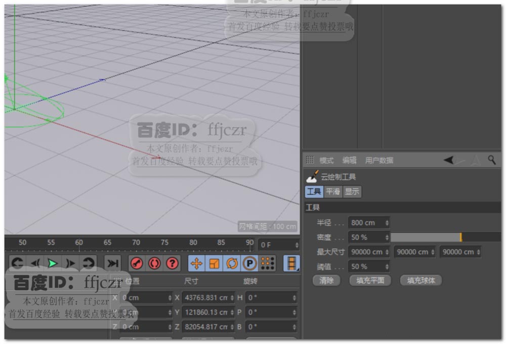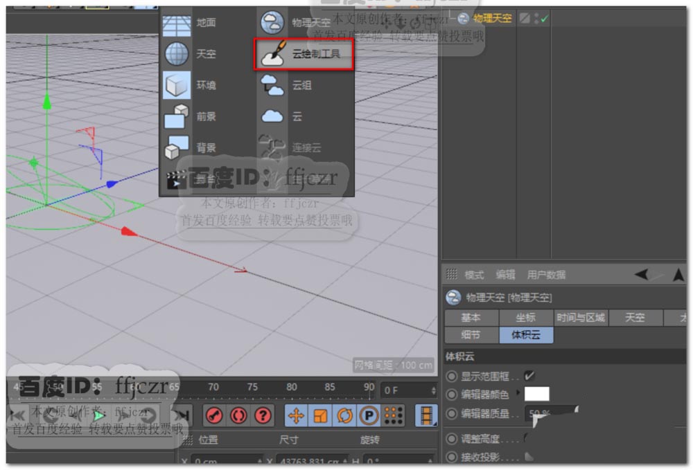 3、鼠標在地面快捷圖標上,按住不放;從彈出的列表中選擇云繪制工具。在云繪制工具中可調整工具的參數(shù),這里只繪制較小的體積云,參數(shù)中更改筆的半徑參數(shù)800,密度為80,其它默認。