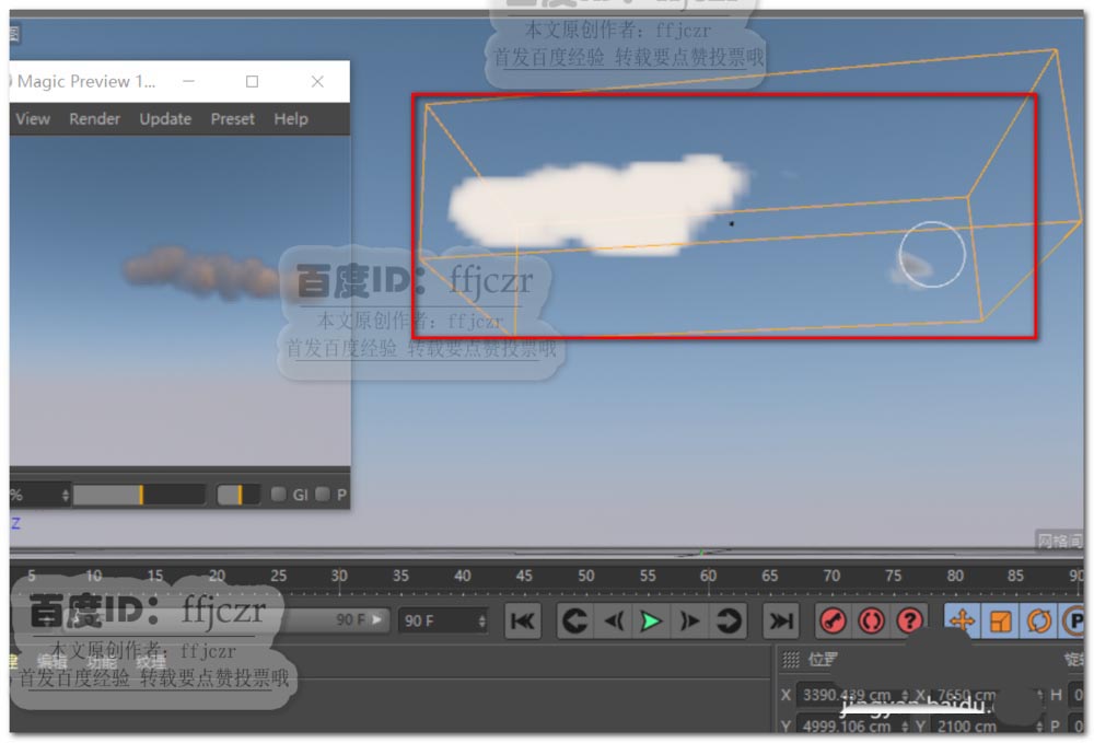 6、在繪制云朵時要注意,軟件的云朵其實是經(jīng)貼圖的方式顯示的,通過調整不同的角度會得到不同的效果,但不要將云朵繪到范圍框的邊上,這樣會出現(xiàn)方塊云的。如圖所示。