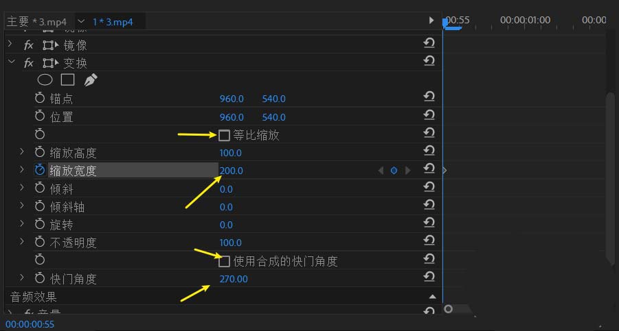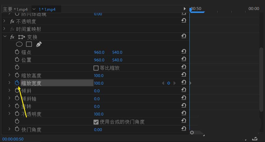 8、再把一個(gè)變換拉上去,把寬度改為兩百(勾上關(guān)鍵幀),記得把等比縮放去掉,快門角度跟剛剛一樣,往前九幀,過渡前一幀,把寬度改回100,大功告成!!