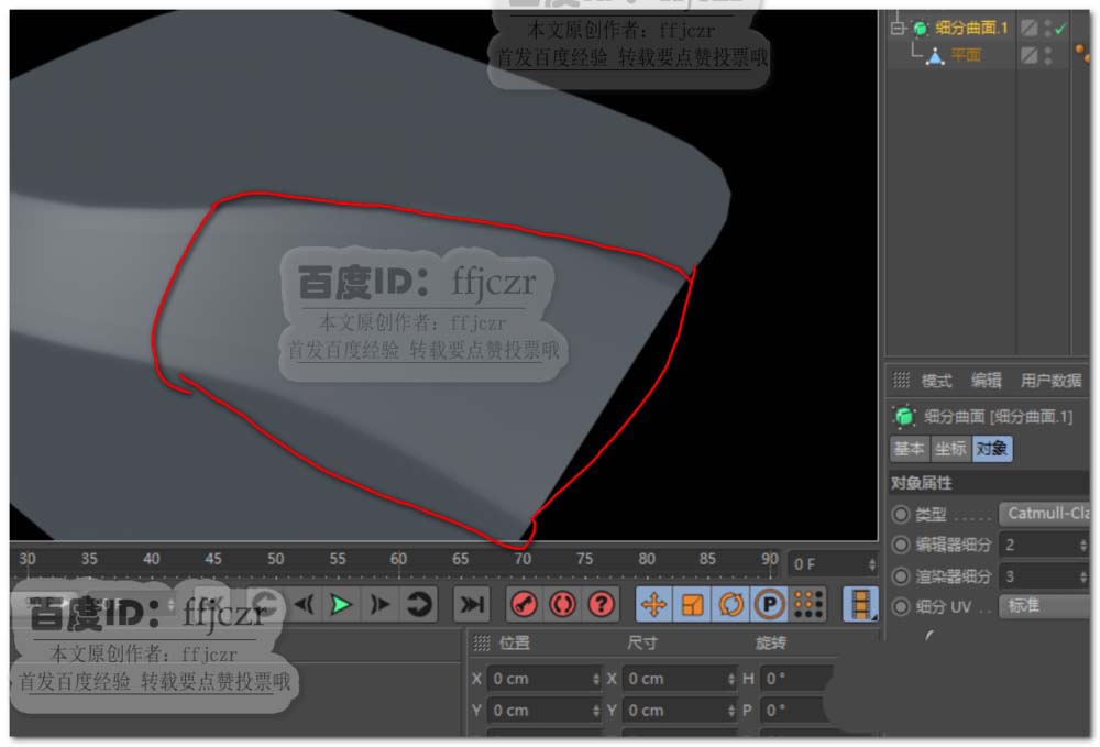 5、倒角后給平面添加一個(gè)細(xì)分曲面,渲染,可以看到倒角處產(chǎn)生了清晰的硬邊效果。但這不是本文所要。本文所要的是紅圈中的硬邊效果消失。