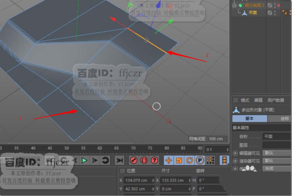 6、邊模式中,分別選中圖示的線1與線2向外移動(dòng)適當(dāng)距離(只選擇一段邊即可)。如圖所示。