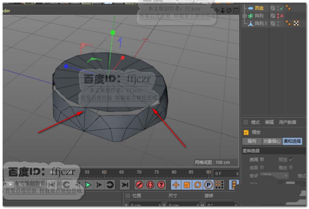 5、創(chuàng)建一個圓盤,旋轉(zhuǎn)分段為18,圓盤分段為1;調(diào)整圓盤旋轉(zhuǎn)分段,讓其中的六條分段正好與陣列的半圓中線重合,如圖所示。將圓盤縮小并向上移動一點距離(這個距離不用太大一點即可,不用具體數(shù)據(jù))。選中圓盤與陣列的六個半圓,連接對象+刪除。