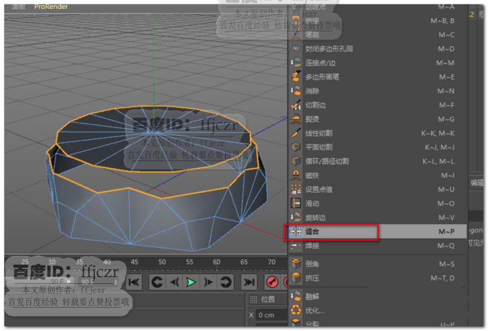 6、選中圓盤的外輪廓邊與六邊型端面的邊,用縫合命令,按住Shift鍵,鼠標(biāo)點選要縫合的點拖動到相對應(yīng)的點放手,即可完成縫合。