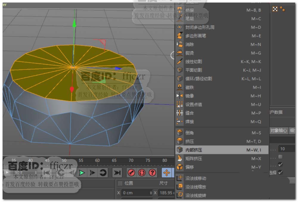 7、選中模型的端面,用內(nèi)部擠壓向仙擠壓一段距離,再向下擠壓,刪除選中的面,即可得到開孔的效果。