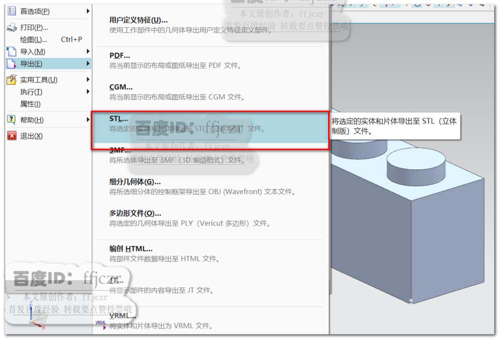 1、三維軟件創(chuàng)建的模型互導(dǎo)使用,是最常見(jiàn)的了。本次講述以STL格式導(dǎo)出的模型在C4D中的使用。UG軟件中,點(diǎn)開(kāi)文件菜單,選擇導(dǎo)出中的STL.將模型保存。