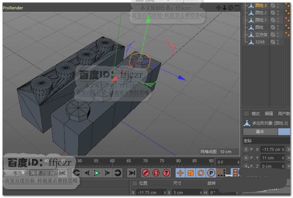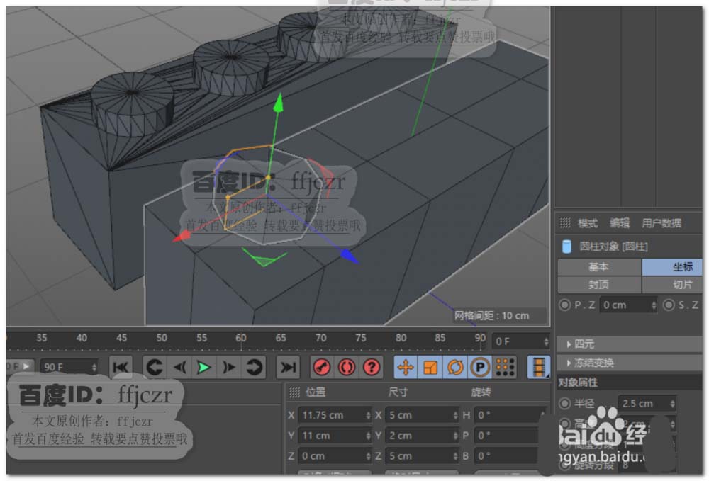 5、創(chuàng)建半徑為2.5高度為2的圓柱,高度分段為1,旋轉(zhuǎn)分段為8;將圓柱圓心調(diào)整到立方體循環(huán)邊縱橫相交的交點(diǎn)上,復(fù)制三個(gè)圓柱調(diào)整到其余的三個(gè)交點(diǎn)上。如圖所示。