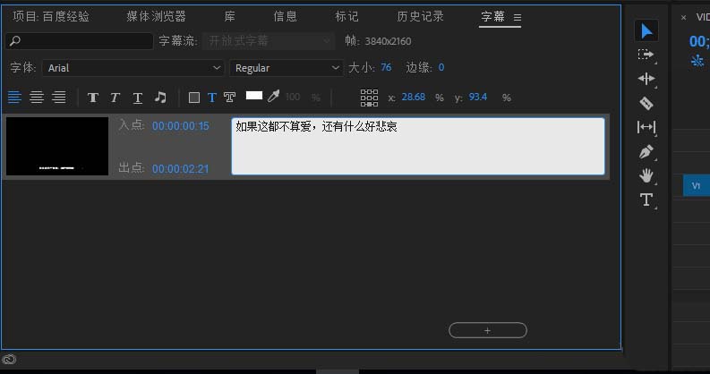 6、找到需要添加字幕的時間點,打開字幕窗口,直接輸入字幕內(nèi)容,并且可以在字幕窗口編輯輸入字幕文字的相關(guān)參數(shù)。這樣就得到了一個開放式字幕。