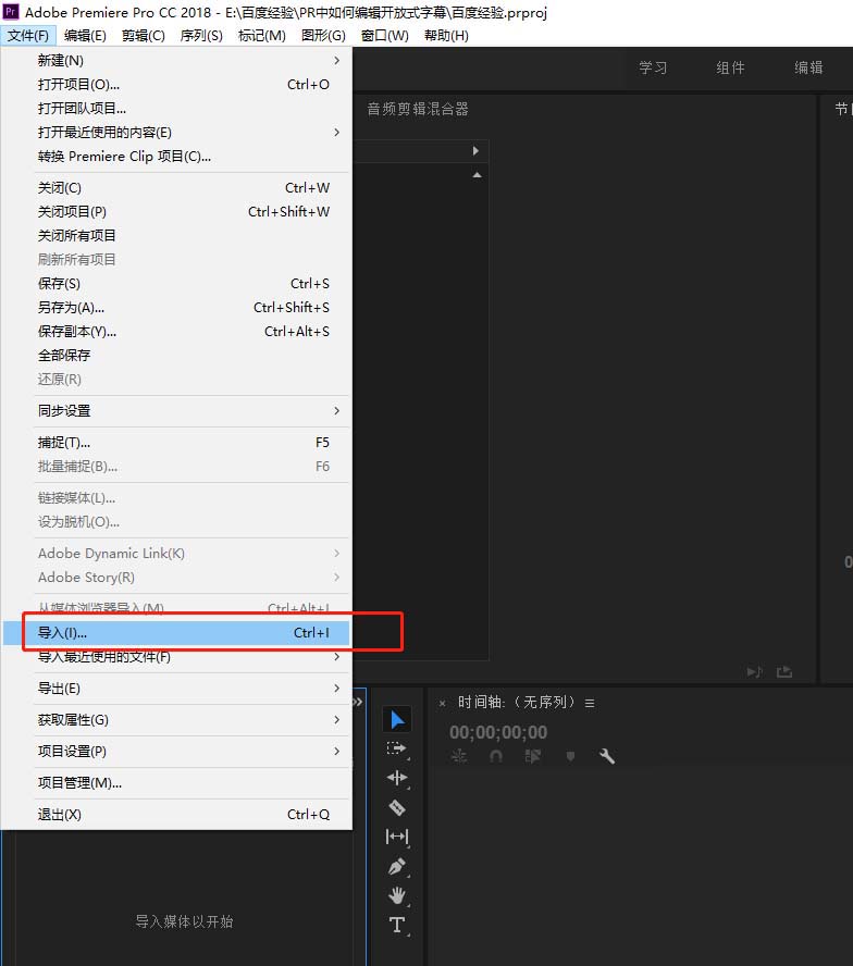1、先來新建一個Premiere剪輯項目,然后在這個PR項目界面中,單擊展開文件菜單,執(zhí)行導(dǎo)入命令。