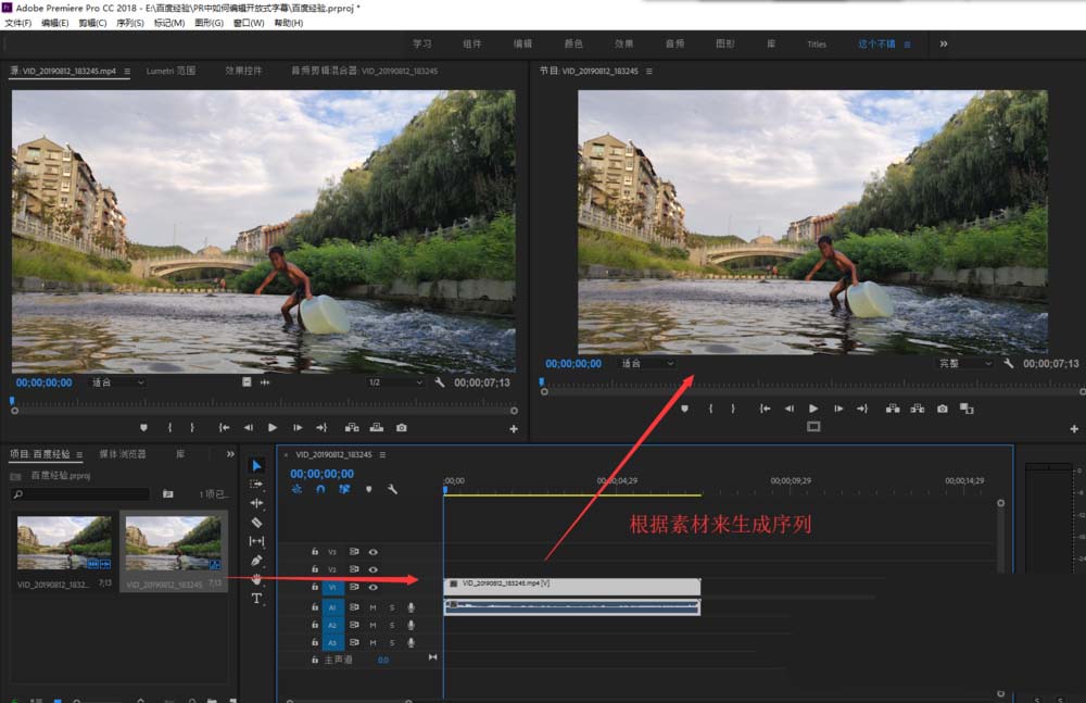 2、執(zhí)行導(dǎo)入之后,選擇視頻素材媒體導(dǎo)入到PR中,然后根據(jù)這個導(dǎo)入的視頻素材媒體來生成一個剪輯序列。