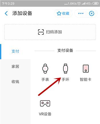 6、然后在添加設(shè)置界面的支付分類下選擇【手環(huán)】設(shè)備。